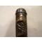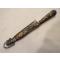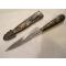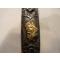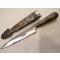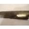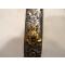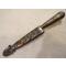 Très beau couteau de gaucho Argentin en métal argenté avec des motifs dorés: un gaucho et un cheval cabré sur le fourreau et une tète de cheval sur la poignée.