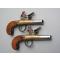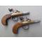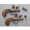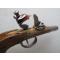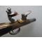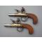 Paire de pistolets de Marine à silex de très belle facture, non signée, sans doute de fabrication anglaise. Platines à l’écossaise, carcasses en bronze, canons cylindriques en acier, poignées en noyer huilé. Les canons se dévissent pour un chargement selon le système à balle forcée. Les deux pistolets de défense qui composent cette paire sont strictement identiques. Ils présentent deux particularités intéressantes. La première est constituée par l’aspect original que leur procure leur coffre en bronze de section circulaire. La seconde est d’ordre mécanique, puisque ces pistolets disposent d’un système de sûreté verrouillant la batterie pour éviter la perte du pulvérin contenu dans le bassinet. Ce système, qui se compose d’un tenon en acier pénétrant dans une mortaise forée dans la partie inférieure de la batterie, est actionné par l’avancement du pontet. Il suffit donc, avant le tir, de repousser le pontet vers l’arrière pour désarmer la sûreté. Ces pistolets d'époque, qui sont strictement d’origine et dans un remarquable état de conservation, sont aptes au tir à la poudre noire.