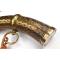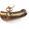 Elle est contituée d'un réservoir en corne entièrement recouvert de laiton ciselé et repoussé.