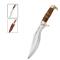 Sa lame incurvée de 26,5 cm en acier inoxydable J420 assure une coupe nette et durable, parfaite pour le hachage, la coupe et les travaux de terrain. Le manche, réalisé en cuir empilé à la main, offre une prise en main sûre et confortable, rehaussée par un pommeau et une garde en laiton poli du plus bel effet.