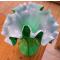 OCCASION COMME NEUVE ---- SUBLIME VASE EN VERRE SOUFFLE A LA BOUCHE MULTI-COUCHES , DANS LE STYLE MURANO DE FORME FLORALE - UNE BELLE COULEUR VERTE PLUS INTERIEUR BLANC + UN SUPERBE BOUTON DE ROSE JAUNE INCRUSTE DANS LA MATIERE - ANNEES 1940/60/ VINTAGE - SON COL TRES EVASE EN COROLLE RAPPELANT UNE FLEUR QUI S'OUVRE - SA BASE MASSIVE, SOLIDE ET LOURDE LUI DONNE UNE ALLURE MAJESTUEUSE, GRACIEUSE ET SCULPTURALE - SA BASE EST EGALEMENT ASSORTIE DE 4 PETITS PIEDS SEMBLANT S'ANCRER DANS LE SOL LUI DONNANT AINSI UNE ASSISE INCOMPARABLE ET STABLE - UNE PIECE DECORATIVE A SOUHAIT QUI S'INSPIRE DU MURANO - ETAT PARFAIT - NI FÊLURE - NI EBRÊCHURE - NI FENTE - NI CASSURE - POIDS = 0,857 kg - HAUTEUR = 28cm - DIAMETRE DU BAS = 12cm - DIAMETRE DU HAUT = 12cm ENVIRON -- TECHNIQUE DE FABRICATION = VERRE SOUFFLE AVEC LA BOUCHE SEULEMENT DONC AUCUNE MARQUE DE MOULAGE, COUPE A LA PINCE A VERRE A CHAUD LAISSANT UNE MICRO TRACE AU CUL, PARFOIS PLUS VOYANTE - AUCUNE SIGNATURE VISIBLE, MAIS UNE EXCELLENTE ET TRES BELLE PIECE REUSSIE EN TOUT POINTS-------