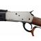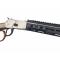 Carabine à levier de sous garde finition acier nickelé + devant M-LOC alu noir + crosse noyer. Canon de 51cm finition nickelé et fileté au pas de 5/8x24. Capacité 10+1. A noter sur le tube magasin et le canon diverses rayures dûes au banc d'épreuve. Prise de visée par hausse réglable en hauteur et guidon fibre optique. A noter hausse montée sur rail monobloc Picatinny pour le montage d'une optique. Garde main en aluminium possédant la norme M-LOC permettant le montage de très nombreux accessoires ( lampe, laser, poignée...). Le devant posséde une vis d'anneau de grenadière, un rail aluminium en son dessous et un porte 4 cartourches sur le coté droit. Bati nickelé avec quelques traces de stockage et traces de laiton légères sur la portière. Levier large LOOP avec un cuir tressé protège main. Crosse noyer et plaque de couche en caoutchouc.