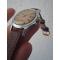 Aiguilles, trotteuse et chiffres dorés sur cadran beige patiné.
