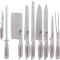 Composition : le lot comprend 1 couteau à pain, 1 couteau à effiler, 1 couteau à désosser, 1 couteau office bec d'oiseau universel, 1 couperet, 1 fourchette à viande deux dents, 1 fusil à aiguiser, 1 couteau de boucher et 1 couteau à découper