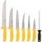 Sac de coutellerie comprenant : 6 couteaux boucher (couteau de cuisine lame 10 cm / couteau boucher lame 27 cm / couteau chef lame 21 cm / couteau à désosser lame 13 cm / couteau desosser flexible lame 15 cm / couteau saigner lame 21 cm + 1 fusil à aiguiser 25 cm).