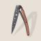 Couteau ultra léger en acier inoxydable Z40C13, finition titane noir. Lame avec cran de sécurité de type 'liner lock' décorée d'une fine gravure au laser. Clip de ceinture. Manche en Bois Corail.