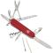 Avec 15 fonctions, 12 outils standard : lame de 7cm et de 4cm, tirebouchon, lame combinée avec décapsuleur, tournevis et isoleur de fil, lame combinée avec ouvreboîte et petit tournevis, poinçon pour piquer, percer et coudre, cure-dent, pincette. Avec en plus : ciseaux, crochet universel et scie à bois. Poids 187g.