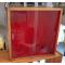 Jolie vitrine murale ou à poser sur un meuble, fabrication artisanale mais soignée, l'intérieur est garni d'adhésif façon velours rouge, avec deux étagères en verre qui délimitent trois compartiments égaux, étagères amovibles et portes coulissantes en verre. Un petit accroc sur l'adhésif du bord intérieur et supérieur, mais c'est quasimment invisible.