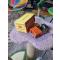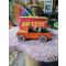 Land rover orange avec un conducteur beige. Le véhicule est en assez bon état, la boîte un peu moins mais pas déchirée.