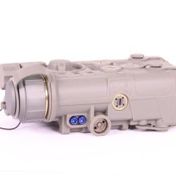 Boitier PEQ avec LED 150 Lumens et laser rouge 635nm et vert 520nm (classe 3A, puissance inférieure à 5mW), pouvant fonctionner avec un switch. Utilise une batterie CR123 (non fournie) qui lui offre une autonomie de 40m.