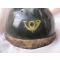 un insigne des chasseurs peint manuellement, et un reste de peinture de grade de capitaine sur le bandeau bourrelet avant en cuir