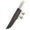 Le Seax Viking court est livré avec une gaine en cuir tanné végétal épaisse et ornée ornée d'un motif de tresse / tressage à la main. Le fourreau est joliment arrondi avec des écailles en os de renfort, des rivets en laiton et deux anneaux de suspension en laiton en forme de serpents enroulés.