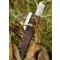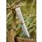 Ce petit couteau de saxophone utilitaire Viking Age (également connu sous le nom de seax à dos cassé en raison de sa forme de lame particulière) a une lame courte en acier à haute teneur en carbone forgée à la main avec une colonne vertébrale épaisse. La poignée en os poli accrocheur est magnifiquement gravée des deux côtés avec un motif nordique dans le style Borre (vers 850-950 après JC) et se termine vers la lame par un collier en laiton. Le capuchon de crosse, également en laiton, est doté d'un oeillet en acier pratique avec un anneau en laiton pour enfiler une lanière ou tirer le couteau de son fourreau (lanière non incluse).