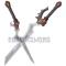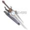 Superbe reproduction de l'épée Shalamayne a double lame utilisé par le Roi Varian Wrynn tiré du jeu Warcraft. Epee a double lame en acier 440 inoxydable. Garde et poignée en acier ornée de rubis. Epee détachable en 2 lames. Support en bois mural fournis.