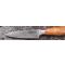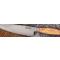 Le manche assure quant à lui une manipulation confortable à son utilisateur. Doté d'une forme bombée, il est composé d'un joli bois d'olivier aux couleurs et aux veines pleines de chaleur. En tant que matériau vivant, le bois offre un veinage unique sur chaque exemplaire du couteau. Un beau rivet à mosaïque est présent au milieu du manche, alors que deux liserés rouges viennent contraster avec le bois. Le lien avec la lame est assurée par une mitre en inox, tandis que le culot est décoré du kanji japonais désignant le mot "Tigre".