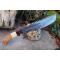 Longueur totale 36cm. Longueur de lame 22.5cm. Lame en acier damas 256 couches. Lame de type tanto. Dents sur le haut de la lame . Lame construction plate semelle. Plaquettes du manche en os & bois. Garde dans la lame. Etui cuir.