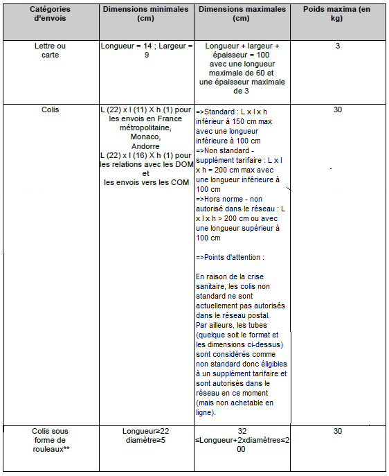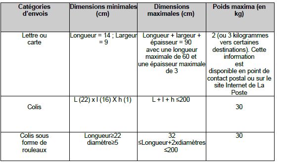 Tableau des dimensions minimales et maximales et des poids maxima applicables pour les envois