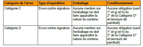 Il existe une réglementation spécifique pour le transport des armes prévue par le code de la Sécurité Intérieure (CSI) qui définit des catégories fondées sur la dangerosité des armes. Le service proposé via NaturaBuy concerne les armes de catégories C et D dont voici les modalités d'expédition :