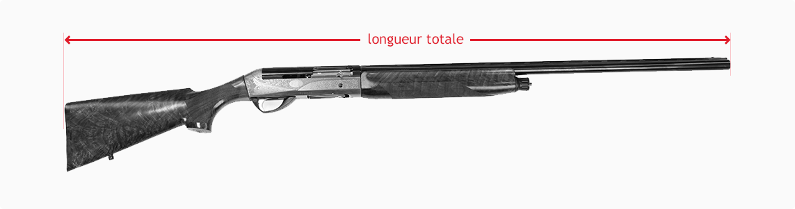 La mesure de la longueur totale d’une arme se prend de la bouche du canon jusqu’au bec de crosse. Cette mesure doit se faire de manière rectiligne (non en biais) comme elle est indiquée sur l’image.