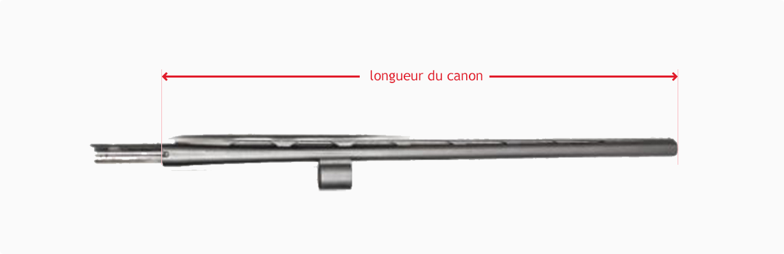 La mesure de la longueur d’un canon, pour un fusil de chasse semi-automatique ou à pompe, se prend de la bouche du canon jusqu’à la tranche arrière de la chambre du canon. Il ne faut pas tenir compte du logement du verrou de la culasse.