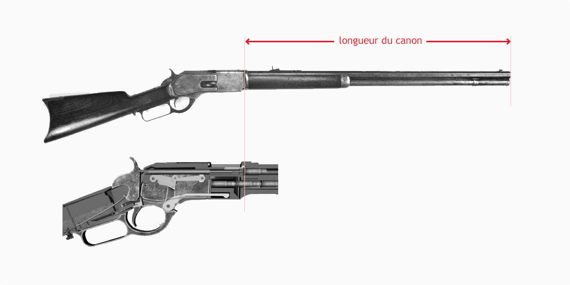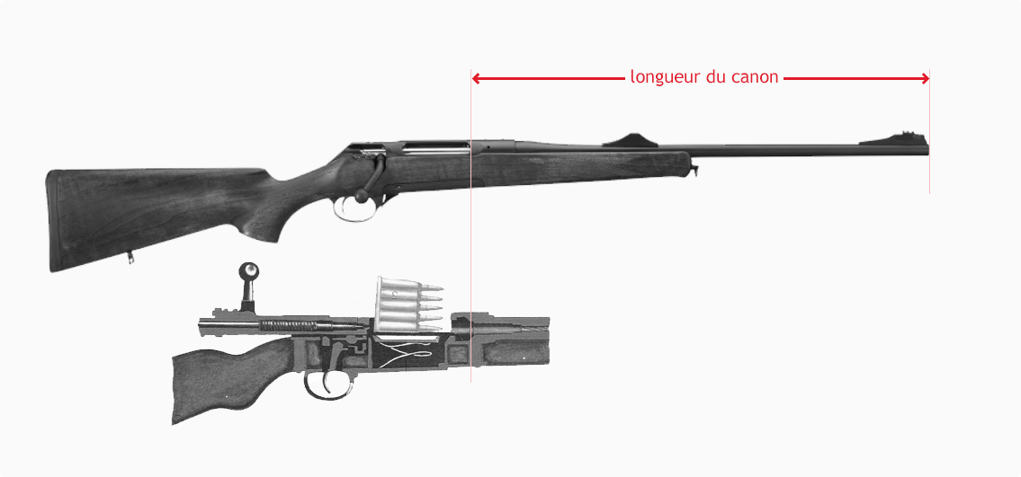 La mesure de la longueur d’un canon, pour une carabine semi-automatique, à pompe, ou à répétition manuelle (culasse linéaire, à rabattement, à levier de sous garde) se prend de la bouche du canon jusqu’à la tranche arrière de la chambre du canon. Il ne faut pas tenir compte du logement de la tête de culasse et/ou des verrous de cette dernière.