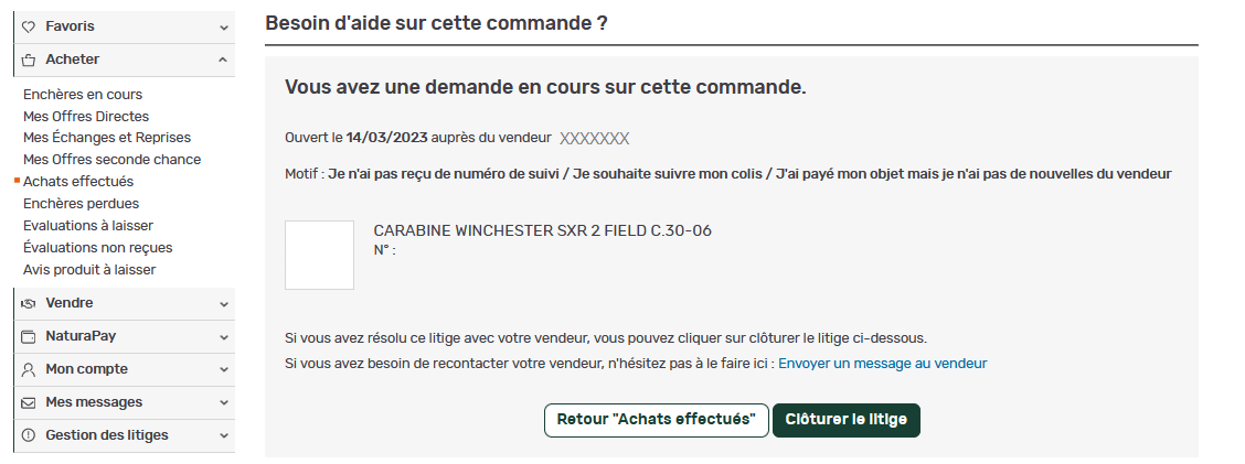 Dans un premier temps, nous vous conseillons de contacter votre vendeur. Ses coordonnées sont disponibles depuis le menu Achats effectués - Coordonnées du vendeur ou en utilisant l'onglet Envoyer un message au vendeur