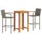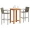 bar de jardin 3 pcs gris bois massif acacia rotinCet ensemble de bar de jardin, au design élégant et contemporain, sera un excellent choix pour manger ou vous détendre dans le jardin. Matériau durable : la résine tressée, également connue sous le nom de poly rotin, est un matériau synthétique solide et nécessitant peu d'entretien qui ressemble au rotin naturel. Elle est légère, facile à nettoyer et couramment utilisée pour les produits d'extérieur en raison de sa durabilité et de ses propriétés de résistance aux intempéries. Fabriqués en résine tressée légère, ces tabourets de bar sont robustes et faciles à déplacer. Plateau de table robuste : le bois d'acacia massif est un beau matériau naturel. Le bois d'acacia est un bois dur tropical, dense, robuste et durable. Fabriquée en bois d'acacia massif, cette table de bar est robuste et stable. Vous pouvez y placer collations, boissons et toutes vos décorations préférées. Expérience d'assise confortable : les repose-pieds intégrés ajoutent un confort d'assise supplémentaire pour le tabouret. Bon à savoir :Pour que vos meubles d'extérieur restent beaux, nous vous recommandons de les protéger avec une housse imperméable. Maximum 110 kg par siège.