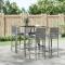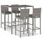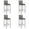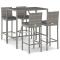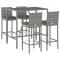 bar de jardin 5 pcs avec coussins gris poly rotinCet ensemble de bar de jardin tendance, combinant à la fois style et fonctionnalité, est sûrement destiné à être la pièce maîtresse de votre jardin, terrasse et de tout autre espace de vie. Matériau résistant aux intempéries : la résine tressée, également connue sous le nom de rotin poly, résiste aux intempéries et est facile à nettoyer. Elle reste belle à l'extérieur pendant une longue période. Elle offre une excellente qualité, commodité et un aspect esthétique.Assise confortable : le tabouret de bar est conçu avec un dossier et un repose-pieds intégré pour vous offrir une assise confortable. Le coussin de siège bien rembourré offre un confort ultime pendant votre temps assis.Dessus en verre trempé : le dessus est en verre trempé, ce qui le rend facile à nettoyer. De plus, il offre un excellent support pour placer vos boissons, collations et vos décorations préférées.Cadre robuste et stable : les cadres en acier enduit de poudre rendent l'ensemble de pub robuste et stable pour une utilisation quotidienne à l'extérieur.Applications larges : la table et le tabouret de bar, avec leur design remarquable, créent un aspect général agréable qui s'intègre sans effort dans n'importe quel décor. Bon à savoir :Pour faciliter au maximum le montage, chaque produit est livré avec des instructions.Remarque :Pour que vos meubles d'extérieur restent beaux, nous vous recommandons de les protéger avec une housse imperméable. Maximum 110 kg par siège. Soyez conscient du risque de feu ouvert et d'autres sources de forte chaleur à proximité de l'appareil.
