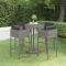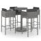 bar de jardin 5 pcs et coussins Résine tressée GrisCet ensemble élégant de bar de jardin vous permet de passer des moments agréables et confortables avec votre famille et vos amis. Fabriqué en rotin PE résistant aux intempéries et à l'eau, cet ensemble de bar d'extérieur est facile à nettoyer, résistant et adapté à un usage quotidien. Le cadre en acier revêtu de poudre rend la table et les tabourets robustes et durables. Le plateau rond est idéal pour poser des boissons, de la nourriture ou des objets décoratifs. Le repose-pieds et les coussins ajoutent un confort d'assise supplémentaire au tabouret. Grâce à la construction légère, tous les éléments sont faciles à déplacer. Remarque : afin de prolonger la durée de vie des meubles d'extérieur, nous vous recommandons de les protéger avec une housse imperméable. Maximum 110 kg par siège. Soyez conscient du risque de feu ouvert et d'autres sources de forte chaleur à proximité de l'appareil.