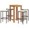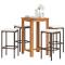 bar de jardin 5 pcs marron bois massif acacia rotinCet ensemble de bar de jardin, au design élégant et contemporain, sera un excellent choix pour manger ou vous détendre dans le jardin. Matériau durable : la résine tressée, également connue sous le nom de poly rotin, est un matériau synthétique solide et nécessitant peu d'entretien qui ressemble au rotin naturel. Elle est légère, facile à nettoyer et couramment utilisée pour les produits d'extérieur en raison de sa durabilité et de ses propriétés de résistance aux intempéries. Fabriqués en résine tressée légère, ces tabourets de bar sont robustes et faciles à déplacer. Plateau de table robuste : le bois d'acacia massif est un beau matériau naturel. Le bois d'acacia est un bois dur tropical, dense, robuste et durable. Fabriquée en bois d'acacia massif, cette table de bar est robuste et stable. Vous pouvez y placer collations, boissons et toutes vos décorations préférées. Expérience d'assise confortable : les coussins d'assise bien rembourrés et les repose-pieds intégrés ajoutent un confort d'assise supplémentaire pour le tabouret. Housse amovible et lavable : ces coussins de siège sont dotés de housses amovibles pour un lavage et un entretien faciles. Bon à savoir :Pour que vos meubles d'extérieur restent beaux, nous vous recommandons de les protéger avec une housse imperméable. Maximum 110 kg par siège. Soyez conscient du risque de feu ouvert et d'autres sources de forte chaleur à proximité de l'appareil.