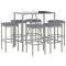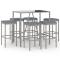 bar de jardin 7 pcs avec coussins gris poly rotinCet ensemble de bar de jardin tendance, combinant à la fois style et fonctionnalité, est sûrement destiné à être la pièce maîtresse de votre jardin, terrasse et de tout autre espace de vie. Matériau résistant aux intempéries : la résine tressée, également connue sous le nom de rotin poly, résiste aux intempéries et est facile à nettoyer. Elle reste belle à l'extérieur pendant une longue période. Elle offre une excellente qualité, commodité et un aspect esthétique.Assise confortable : le tabouret de bar est conçu avec un repose-pieds intégré pour vous offrir une assise confortable. Le coussin de siège bien rembourré offre un confort ultime pendant votre temps assis.Dessus en verre trempé : le dessus est en verre trempé, ce qui le rend facile à nettoyer. De plus, il offre un excellent support pour placer vos boissons, collations et vos décorations préférées.Cadre robuste et stable : les cadres en acier enduit de poudre rendent l'ensemble de pub robuste et stable pour une utilisation quotidienne à l'extérieur.Applications larges : la table et le tabouret de bar, avec leur design remarquable, créent un aspect général agréable qui s'intègre sans effort dans n'importe quel décor. Bon à savoir :Pour faciliter au maximum le montage, chaque produit est livré avec des instructions.Remarque :Pour que vos meubles d'extérieur restent beaux, nous vous recommandons de les protéger avec une housse imperméable. Maximum 110 kg par siège. Soyez conscient du risque de feu ouvert et d'autres sources de forte chaleur à proximité de l'appareil.