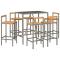 bar jardin 7 pcs gris poly rotin/bois massif acaciaCet ensemble de bar de jardin tendance, combinant à la fois style et fonctionnalité, est sûrement destiné à être la pièce maîtresse de votre jardin, terrasse et de tout autre espace de vie. Matériau résistant aux intempéries : la résine tressée, également connue sous le nom de rotin poly, résiste aux intempéries et est facile à nettoyer. Elle reste belle à l'extérieur pendant une longue période. Elle offre une excellente qualité, commodité et un aspect esthétique.Assise confortable : la chaise de bar est conçue avec un repose-pieds intégré et un dossier en bois pour vous offrir une expérience d'assise confortable. L'assise en bois confère à la chaise un aspect naturel et agréable tout en assurant sa stabilité.Dessus en verre trempé : le dessus est en verre trempé, ce qui le rend facile à nettoyer. De plus, il est idéal pour placer vos boissons, collations et vos décorations préférées.Cadre robuste et stable : les cadres en acier enduit de poudre rendent l'ensemble de pub robuste et stable pour une utilisation quotidienne à l'extérieur.Applications larges : la table et les chaises de bar, avec leur design remarquable, créent un aspect général agréable qui s'intègre sans effort dans n'importe quel décor. Bon à savoir :Pour faciliter au maximum le montage, chaque produit est livré avec des instructions.Remarque :Pour que vos meubles d'extérieur restent beaux, nous vous recommandons de les protéger avec une housse imperméable. Maximum 110 kg par siège.