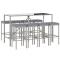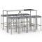 bar de jardin 9 pcs avec coussins gris poly rotinCet ensemble de bar de jardin tendance, combinant à la fois style et fonctionnalité, est sûrement destiné à être la pièce maîtresse de votre jardin, terrasse et de tout autre espace de vie. Matériau résistant aux intempéries : la résine tressée, également connue sous le nom de rotin poly, résiste aux intempéries et est facile à nettoyer. Elle reste belle à l'extérieur pendant une longue période. Elle offre une excellente qualité, commodité et un aspect esthétique.Assise confortable : le tabouret de bar est conçu avec un repose-pieds intégré pour vous offrir une assise confortable. Le coussin de siège bien rembourré offre un confort ultime pendant votre temps assis.Dessus en verre trempé : le dessus est en verre trempé, ce qui le rend facile à nettoyer. De plus, il offre un excellent support pour placer vos boissons, collations et vos décorations préférées.Cadre robuste et stable : les cadres en acier enduit de poudre rendent l'ensemble de pub robuste et stable pour une utilisation quotidienne à l'extérieur.Applications larges : la table et le tabouret de bar, avec leur design remarquable, créent un aspect général agréable qui s'intègre sans effort dans n'importe quel décor. Bon à savoir :Pour faciliter au maximum le montage, chaque produit est livré avec des instructions.Remarque :Pour que vos meubles d'extérieur restent beaux, nous vous recommandons de les protéger avec une housse imperméable. Maximum 110 kg par siège. Soyez conscient du risque de feu ouvert et d'autres sources de forte chaleur à proximité de l'appareil.