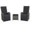 bistro 3 pcs avec coussins Résine tressée GrisNotre ensemble de bistro en résine tressée apportera une touche d'élégance moderne à votre terrasse, balcon ou jardin avec son design sobre et élégant. Grâce au dossier et au repose-pied réglables des fauteuils inclinables, vous pouvez vous asseoir confortablement et vous détendre complètement. Fabriqué en résine tressée résistante aux intempéries, l'ensemble de mobilier d'extérieur est facile à nettoyer, résistant à l'usure et convient à un usage quotidien. Le cadre en acier enduit de poudre rend les fauteuils et la table très robustes et durables. La table a un dessus de table en verre. Les chaises inclinables vous offrent tout le confort nécessaire. Le dossier s'inclinera en tirant sur le bouton situé sur le côté. Grâce à sa construction légère, l'ensemble du mobilier est facile à déplacer. Cet ensemble est également livré avec des coussins de siège très confortables et épaississement rembourrés pour un confort ultime. Les housses en polyester nécessitant peu d'entretien peuvent également être enlevées et lavées. La livraison comprend 2 fauteuils, 1 table et 2 coussins d'assise. L'ensemble de bistro est facile à assembler. Remarque : Nous vous recommandons de couvrir les fauteuils et la table sous la pluie, la neige et le gel.