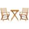 bistro 3 pcs beige tissu et bois massifSavourez une tasse de café ou discutez avec votre famille et vos amis dans le jardin, l'arrière-cour ou sur le balcon avec cet ensemble de bistro ! Robuste et stable : le bois d'acacia massif est connu pour sa solidité et sa durabilité. Ses couleurs variées et ses grains uniques lui confèrent un aspect attrayant. Sa stabilité et sa résistance aux intempéries en font un matériau idéal pour la fabrication de meubles d'intérieur et d'extérieur.Conception pratique : la main courante en bois, pratique et plate, vous permet de poser vos mains dessus tout en profitant d'un moment en plein air.Dessus de table robuste : la table d'extérieur offre un excellent support pour accueillir vos boissons, collations, corbeilles de fruits et vos décorations préférées.Design pliable : la table et les chaises de salle à manger d'extérieur peuvent être facilement repliées lorsqu'elles ne sont pas utilisées pour faciliter le rangement et le transport. Bon à savoir :Pour que vos meubles d'extérieur restent beaux, nous vous recommandons de les protéger avec une housse imperméable. Maximum 110 kg par siège.