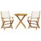 bistro 3 pcs blanc crème tissu et bois massifSavourez une tasse de café ou discutez avec votre famille et vos amis dans le jardin, l'arrière-cour ou sur le balcon avec cet ensemble de bistro ! Robuste et stable : le bois d'acacia massif est connu pour sa solidité et sa durabilité. Ses couleurs variées et ses grains uniques lui confèrent un aspect attrayant. Sa stabilité et sa résistance aux intempéries en font un matériau idéal pour la fabrication de meubles d'intérieur et d'extérieur.Conception pratique : la main courante en bois, pratique et plate, vous permet de poser vos mains dessus tout en profitant d'un moment en plein air.Dessus de table robuste : la table d'extérieur offre un excellent support pour accueillir vos boissons, collations, corbeilles de fruits et vos décorations préférées.Design pliable : la table et les chaises de salle à manger d'extérieur peuvent être facilement repliées lorsqu'elles ne sont pas utilisées pour faciliter le rangement et le transport. Bon à savoir :Pour que vos meubles d'extérieur restent beaux, nous vous recommandons de les protéger avec une housse imperméable. Maximum 110 kg par siège.