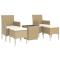 bistro 5 pcs Résine tressée et verre trempé BeigeCet ensemble élégant de bistro de jardin vous permet de passer des moments agréables et confortables avec votre famille et vos amis. Avec un cadre en acier enduit de poudre recouvert de résine tressée résistante aux intempéries avec protection UV, la table et les chaises sont durables et stables. Conçues avec un dossier et des accoudoirs incurvés, les chaises vous offrent du confort. Les coussins sont inclus pour plus de confort et la housse à fermeture éclair est amovible pour un lavage facile. Le dessus de table est en verre trempé renforcé avec un support résistant, facile à nettoyer et à entretenir. Les deux repose-pieds vous offrent également des places d'assise supplémentaires. De plus, la construction légère rend chaque pièce facile à déplacer, à réorganiser et à transporter. Remarque : afin de prolonger la durée de vie de votre mobilier d'extérieur, nous vous recommandons de le protéger avec une housse imperméable. Maximum 110 kg par siège. Soyez conscient du risque de feu ouvert et d'autres sources de forte chaleur à proximité de l'appareil.