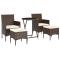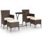 bistro de jardin 5 pcs poly rotin et verre trempéCet ensemble élégant de bistro de jardin vous permet de passer des moments agréables et confortables avec votre famille et vos amis. Avec un cadre en acier enduit de poudre recouvert de résine tressée résistante aux intempéries avec protection UV, la table et les chaises sont durables et stables. Conçues avec un dossier et des accoudoirs incurvés, les chaises vous offrent du confort. Les coussins sont inclus pour plus de confort et la housse à fermeture éclair est amovible pour un lavage facile. Le dessus de table est en verre trempé renforcé avec un support résistant, facile à nettoyer et à entretenir. Les deux repose-pieds vous offrent également des places d'assise supplémentaires. De plus, la construction légère rend chaque pièce facile à déplacer, à réorganiser et à transporter. Remarque : afin de prolonger la durée de vie de votre mobilier d'extérieur, nous vous recommandons de le protéger avec une housse imperméable. Maximum 110 kg par siège. Soyez conscient du risque de feu ouvert et d'autres sources de forte chaleur à proximité de l'appareil.