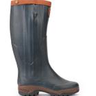 On ne sent pas du tout la botte lors du port. Le caoutchouc est vraiment souple et très confortable lors des flexions et des phases de marche. Deux lanières de caoutchouc marron finissent le haut de la botte. Elles enchâssent le logo Aigle et son liseré bleu blanc rouge.