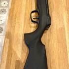 C'est une crosse en polymère technique noir qui équipe notre X-Blade de test. Elle semble simple et basique au premier regard mais dès qu'on saisit l'arme on prend conscience des zones de reliefs et ces renflements offrent une très bonne prise en main. La crosse est très bien finie, sans trace de moulure et sans bavures. C'est une arme pour adulte car les cotes sont assez massives. La poignée pistolet mesure 4,2 cm au plus large ! Cette poignée pistolet reçoit un discret et agréable quadrillage de surface afin d'améliorer le grip. Le dos de la crosse est surélevé avec un busc type Monte Carlo qui permet au tireur d'avoir un bon appui une fois une optique de visée fixée sur la lunette. Le sabot amortisseur fixé à la fin de la crosse est assez épais et ne déborde pas, preuve d'un soin élevé de fabrication. Seule la peinture jaune du logo de la tête de cerf de Browning a un peu bavé car celui-ci en creusé dans la crosse. Un détail.