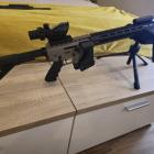 Cette nouvelle carabine 22 Long Rifle est vraiment superbe et va plaire aux amateurs d'armes réglementaires et tactiques ! Sous une allure très réussie de fusil de type AR15 cette petite carabine de tir de loisir possède un chargeur de 10 coups et un fonctionnement à verrou. Le canon rayé bien sûr mesure 47 cm et il est terminé par un filetage au pas de 1/2x20 UNF qui permet de fixer un petit cache flamme comme ici ou un modérateur de son. Les éléments sont très bien réalisés, la crosse télescopique permet de régler la longueur en fonction de la morphologie et de la position de tir. Le devant dispose de système de fixation Keymod ce qui facilite la pose d'accessoires. Le long rail de fixation qui court sur le boitier de culasse et le devant offre de nombreuses positions pour installer une lunette de tir ou un viseur à point rouge.