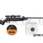 Son canon de 43 cm guide bien le vol des diabolos à jupe. Les organes de visée ouverte comportent une hausse réglable en hauteur et dérive ainsi qu’un guidon protégé par un tunnel. Un rail prismatique de 11 mm est fraisé sur le dessus du cylindre contenant le piston et permet la pose rapide d’une lunette de visée. Cette lunette est d’ailleurs fournie dans ce pack. Il s’agit d’un modèle Beeman de grossissement 4x avec un objectif de 20 mm.
