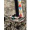 manche en bois, la pierre est travaillée avec un tranchant pour y loger un cuir de cerf brut et le tout est maintenu par des liens en tendons de cerf