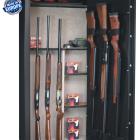 Ce grand coffre peut contenir 11 armes avec lunette et 3 dans la porte. Une capacité record avec malgré tout un gabarit et donc un encombrement assez réduit. Robuste, ce coffre-fort est très bien fini avec un revêtement en moquette à l'intérieur qui préserve les beaux bois de vos armes à feu !