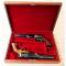 En 2000, la firme Pietta a produit en quantité limitée ce beau coffret commémoratif des armées américaines de l'Union et de la Confédération, avec 2 revolvers de type Colt 1851, en calibre .44. Je n'ai jamais pris la peine de doter ce coffret d'accessoires (moule à balles, poire à poudre...), car les revolvers ont toujours été exposés hors du coffret. Mes revolvers portent la mention imprimée sur le dessus du canon "Limited Edition 1 of 1000", mais je ne saurais affirmer qu'il s'agit là du premier coffret produit… Les 2 revolvers ont une finition supérieure à l'ordinaire de Pietta (polissage et bronzage des canons), et ils bénéficient d'une petite fantaisie près de la bouche du canon ; les leviers-refouloirs sont en acier jaspé ; les cadres de poignée sont en laiton, et les poignées sont en bois de noyer, joliment veiné.