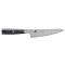 Couteau japonais Shotoh, série Miyabi 5000 FCD - design Damas 49 couches Le Shotoh est un petit couteau servant à nettoyer, peler et couper les fruits et légumes, comme le couteau d'office européen Lame de 13 cm Lame damas 49 couches - acier MC61 Le processus de durcissement des lames FRYODUR ® leur apporte une dureté d'environ 61 HRC Manche ergonomique en micarta incrusté d'une mosaïque """"pin"""". Mitre et pommeau en acier inoxydable, avec sigle MIYABI Fabriqué à SEKI, Japon, par Zwilling J.A. Henckels Japan