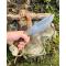 sur le manche du couteau 2 perles turquoise avec une dent de coyote montée sur une dragonne tressée en fibre naturelle