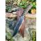 manche en corne d'antilope marron clair / foncé , garde , mitre et pommeau en acier martelé bronzé