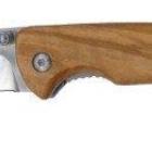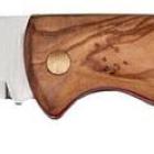 Le manche en bois d’olivier, offre un toucher agréable et de belles veines, un plaisir pour les yeux. Il est aussi profilé pour donner la meilleure et la plus confortable des prises en main possible avec un décrochement servant à bien caler son index, faisant office de "fausse garde". Le manche est aussi doté dans sa partie finale d’un oeillet permettant d’attacher le couteau à un lacet de cuir, par exemple.