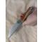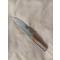 couteau forgé en acier carbone, émouture plate, trempe à l'huile. Montage en plate de semelle, manche en plaquettes de résine blanche et bois de cade. Etui en cuir.